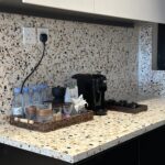 A sleek, fully-equipped kitchen with modern appliances including a refrigerator, microwave, electric kettle, and full cookware set