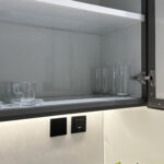 A modern kitchen with essential appliances (microwave, refrigerator, electric kettle, cookware)