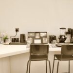A fully equipped kitchen with a refrigerator, microwave, and kettle